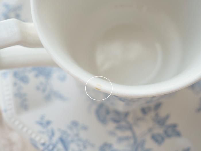 カップ縁に長さ3ミリの着色、3×4ミリの欠け、
